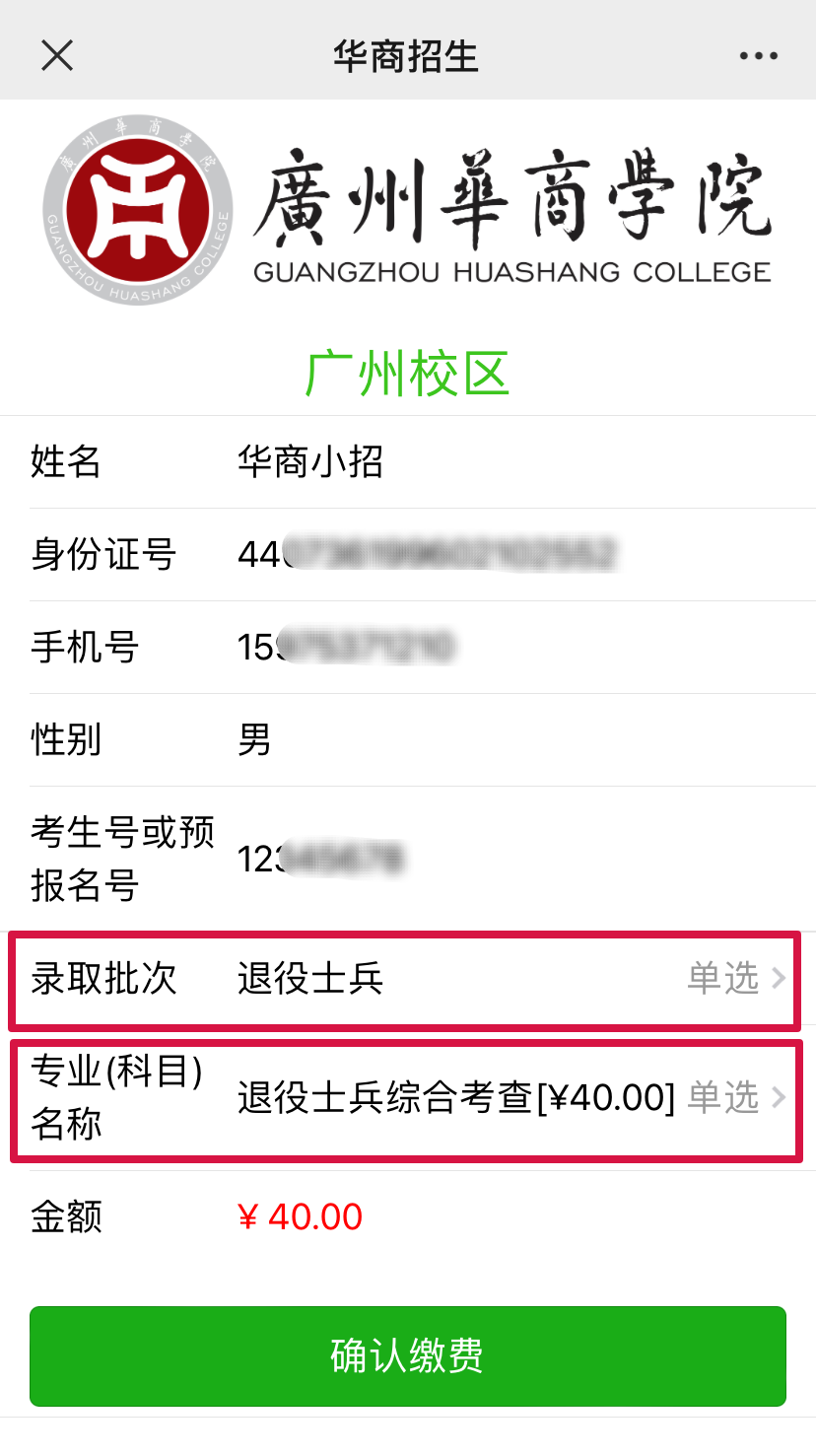 方式2. 进入“广州华商学院招生办公众号”,选择菜单栏“招生资讯”—“报考费”;进入缴费页面;准确填写个人信息,点击“下一步”;选择退役士兵批次及科目;核对相应金额,无误后点击“确认缴费”即可。