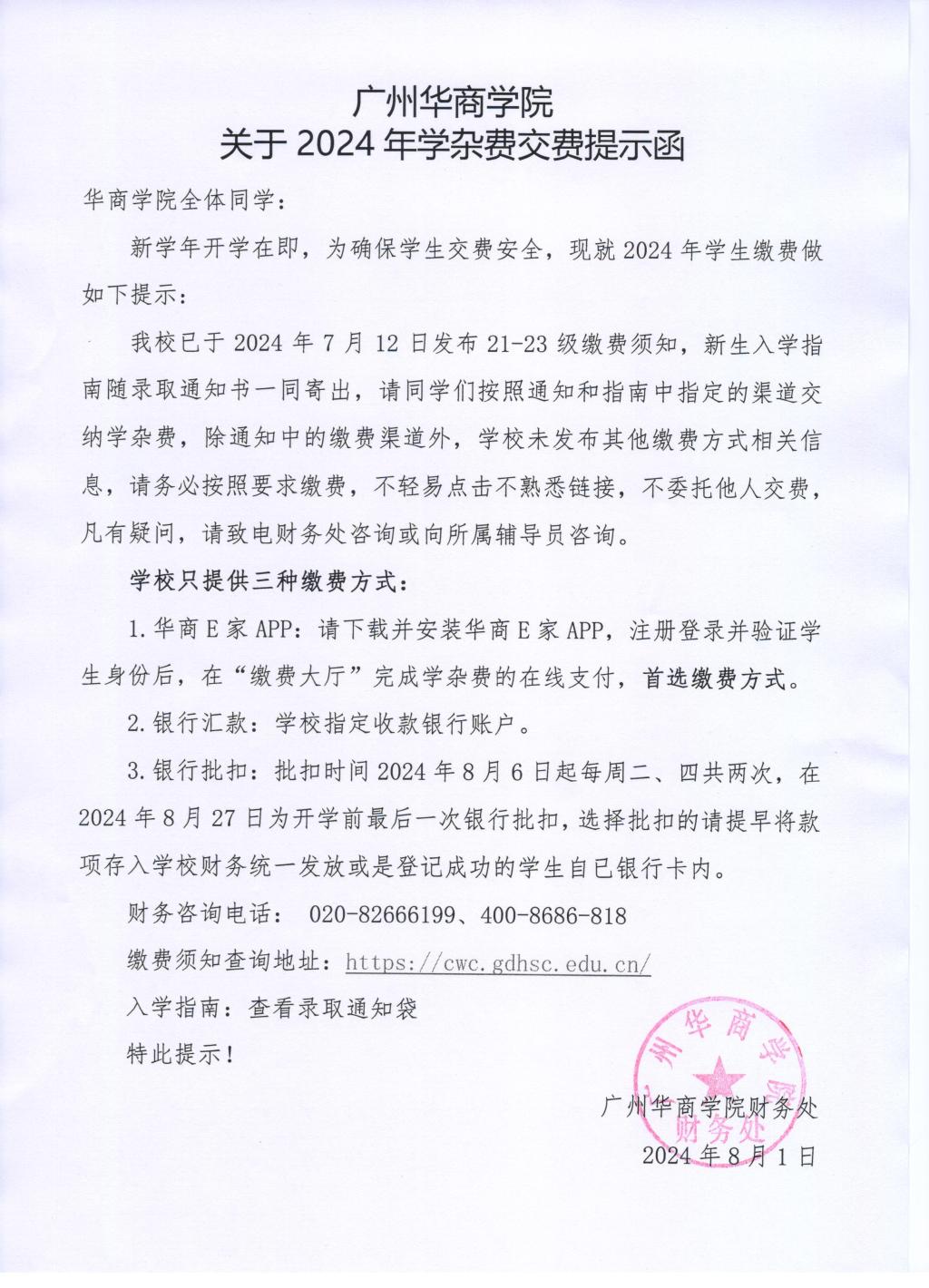 广州华商学院关于2024年学杂费交费提示函