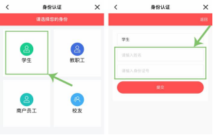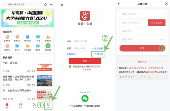 ① 打开华商E家APP, 点击下方主菜单“我”,点击“立即注册”,进入注册界面 ② 输入昵称、手机号码、密码等点击提交注册,然后进入验证页面,选择“学生” ③ 输入姓名和身份证号码进行验证,验证后即可凭手机号码及密码登录